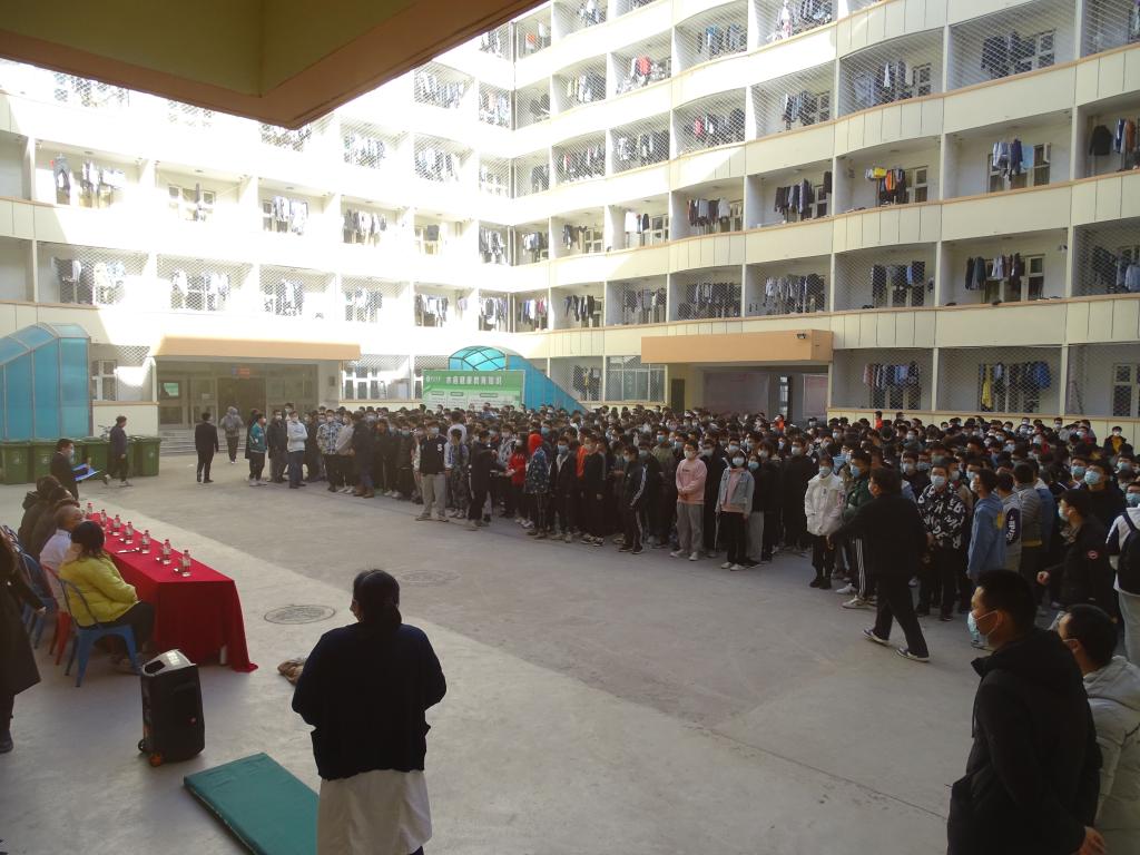中午12点40分,警铃一响,伴随着烟雾,学生们迅速从防火通道口有序撤离,只见他们一个个表情严肃,用毛巾捂住口鼻,迅速而有序的从安全出口撤离“火灾”,现场楼内疏散人员按照预先的消防演习方案疏散学生,保证在楼内学生的安全,以免慌乱中出现拥挤或者踩伤学生现象。学生们逃生到安全地带之后,按照班级排成方队,等候指示。