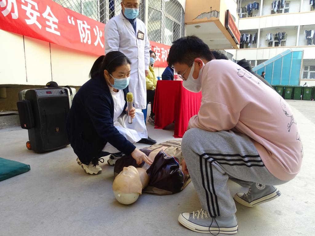 此后,校医院白毅医生对急救知识进行展示和演说,亲自向同学们展示心肺复苏模拟流程等。演习的第三项由保卫处向远峰老师进行灭火器使用方法的慢动作解析,并安排学生代表动手操作并进行试验。