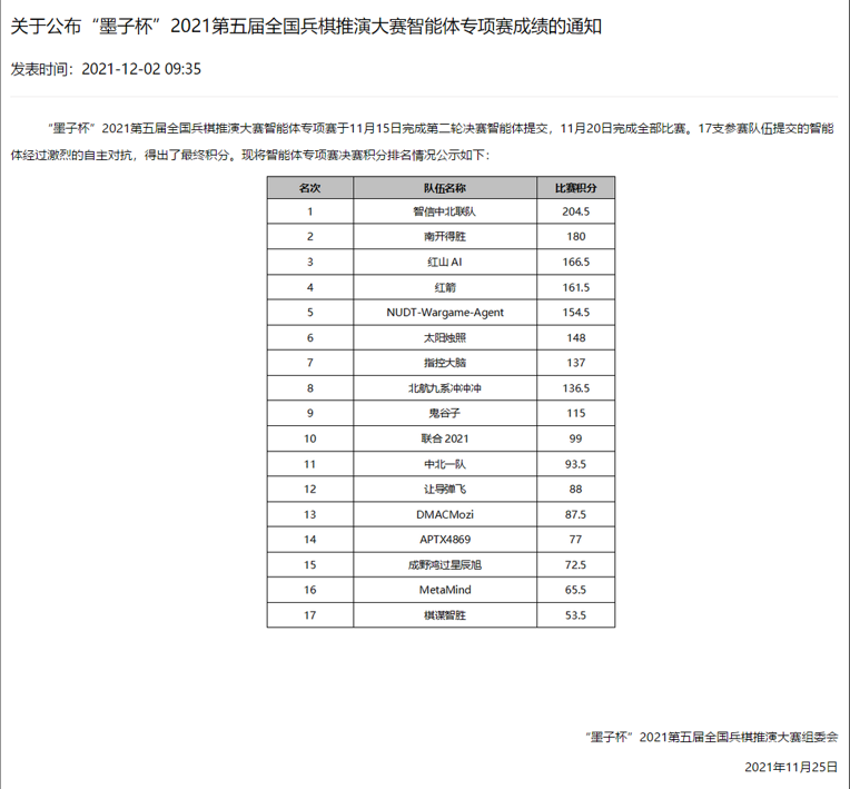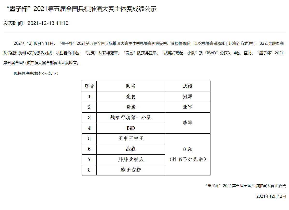等单位协办的“墨子杯”2021第五届全国兵棋推演大赛总决赛在线上成功举办。