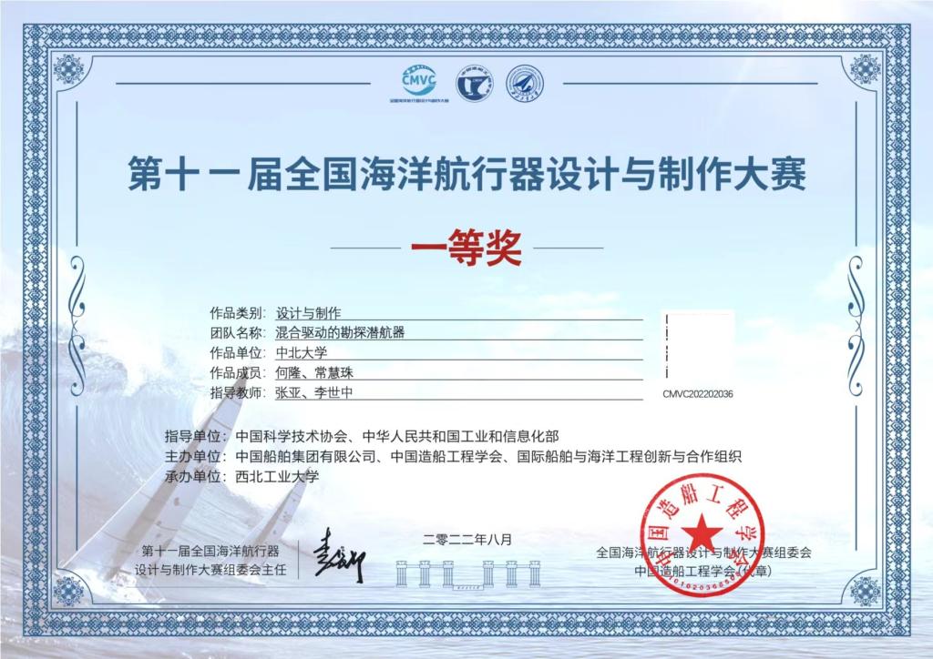 研究生何隆、常慧珠的作品“混合驱动的勘探潜航器”获得国赛“设计与制作--水下指定功能组”的一等奖,是山西省高校中唯一的设计与制作组的全国一等奖。