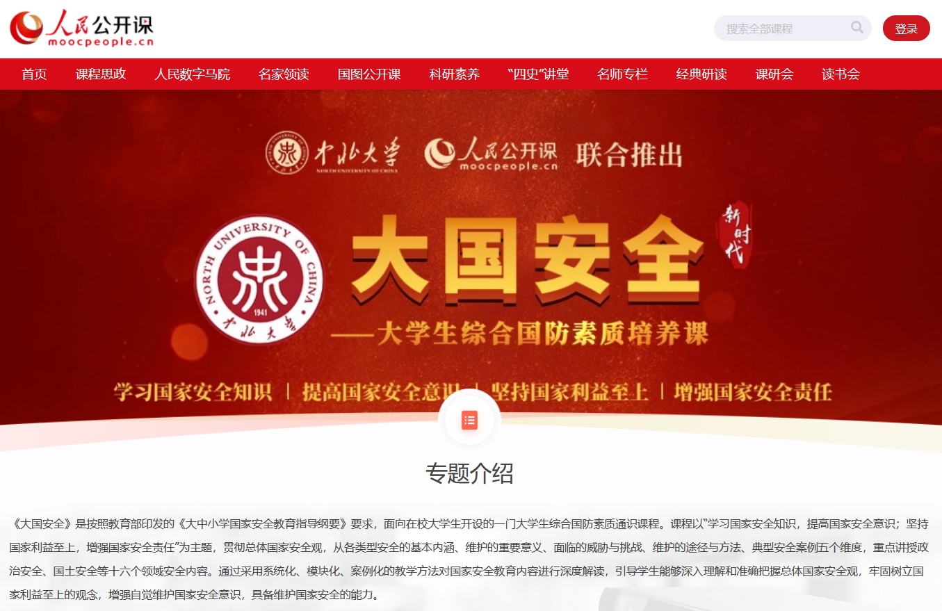 建设的又一门“课程思政”特色课--《大国安全》成功上线人民网-人民公开课。此前,该课程已先后上线智慧树、学堂在线、军职在线、学银在线、超星尔雅等多个教学资源平台,选课学校包括吉林大学、沈阳理工大学、延安大学、蚌埠大奶做爱等十多所院校,选课学生超过1万人,累计点击率超过200万,课程建设取得明显成效。