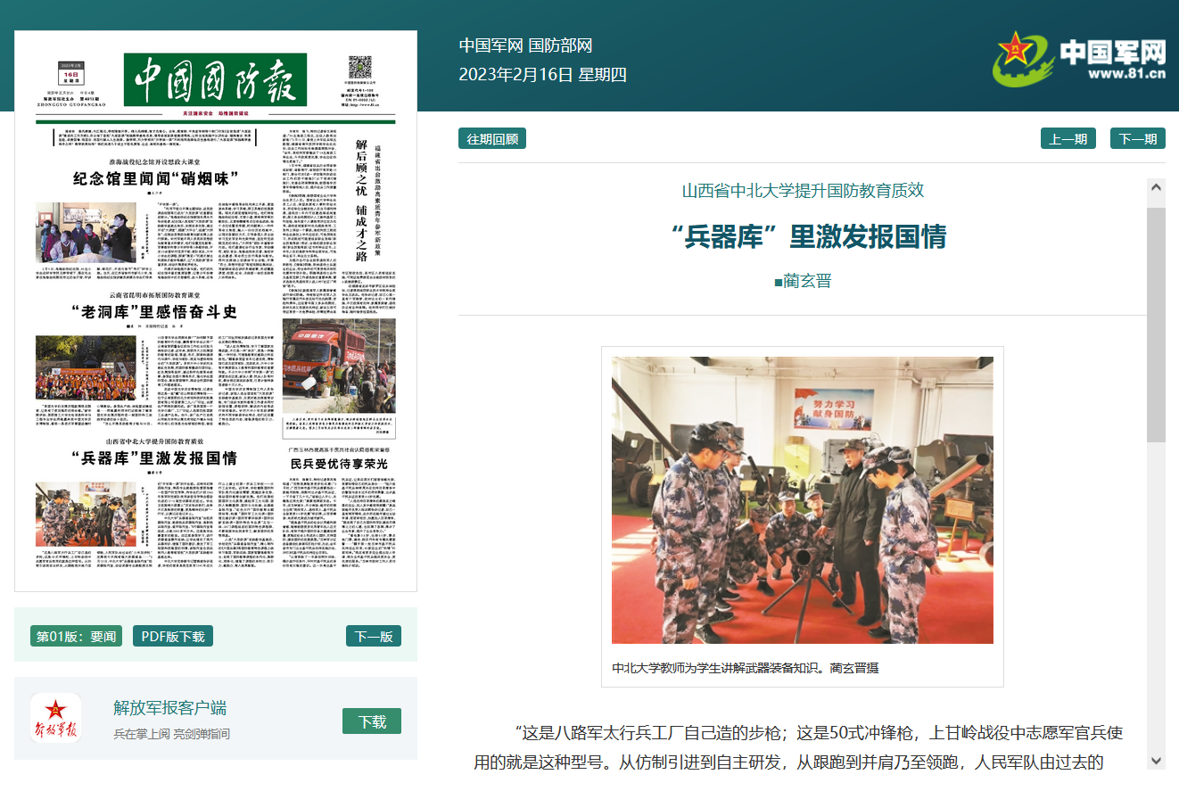 提升国防教育质效---“兵器库”里激发报国情”为题报道了我校教育部“大思政课”实践教学基地建设情况。