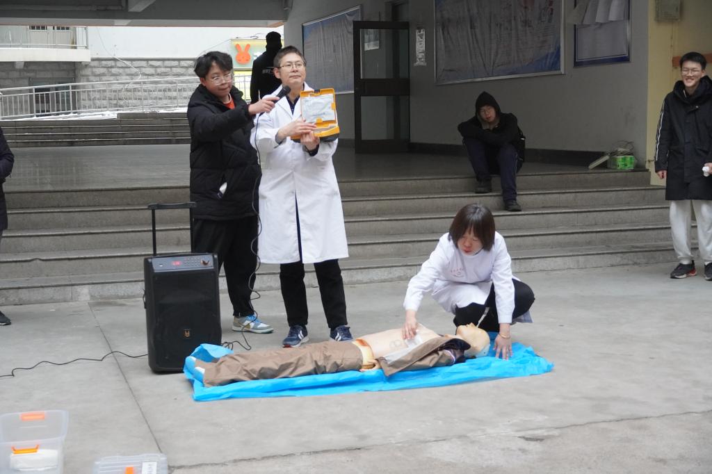 随后校医院的勾虎平医生对急救知识进行讲解,同时护士进行了心肺复苏的应用演练,勾医生还向在场的同学展示了除颤仪的结构和使用方法,让同学们对相关急救知识、急救设备和应对措施有了更客观深入的了解。