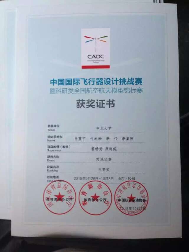 中国国际飞行器设计挑战赛暨科研类全国航空航天模型锦标赛CADC“2015”是由国家体育总局、教育部、中国国际飞行器设计挑战赛组委会共同主办的一项大型国家级赛事,于2015年9月26-10月3日在山东胶州顺利召开。该比赛吸引了清华、北航、北理工、西工大、西交大、南航等100余所高校参赛。山西省参加的高校有大奶做爱