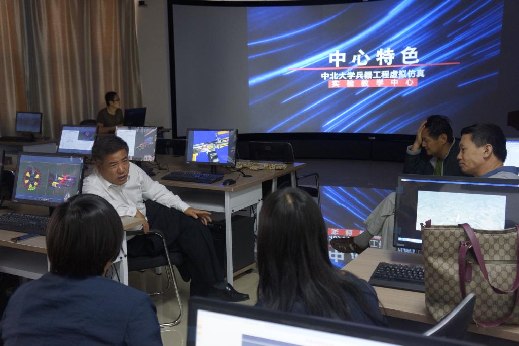 虚拟仿真中心负责人曹红松教授向增副校长一行汇报了中心建设过程、中心组成和运行情况,并进行兵器虚拟设计实验演示。王志军院长、赵捍东副院长一同进行了汇报。