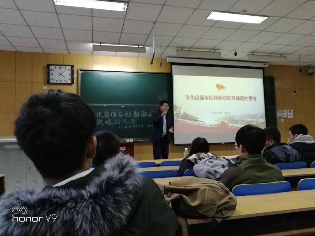 ,以“文化自信与创新驱动发展战略的思考”为题,用言简意赅、风趣诙谐的话语从中西方文化、思维差异入手,讲到近年来我国坚持和平发展战略,在几次世界经济的动荡和危机中稳定发展,及这样的发展离不开中国共产党的正确领导。他为大家讲解了我国近年来众多战略举措计划以及一些不为大家理解的决定,纠正了大家的一些错误认知,并教导我们要培养文化自觉、树立文化自信、注重文化传承、坚持文化发展、保障文化安全,引导大家把十九大精神内化于心,外化于行,坚定文化自信,为实现中华民族伟大复兴的中国梦而奋斗。