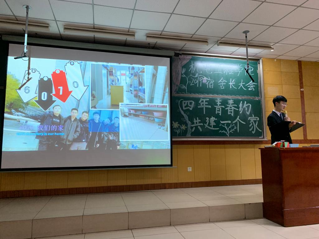 宿管部的工作成果与风采;副部梁日南同学进行了宿舍安全卫生知识与和谐宿舍规定的宣讲,期间穿插防诈骗话剧表演,生动有趣,充满教育意义,让同学们充分认识到了建设卫生良好宿舍与文明和谐宿舍及排除安全隐患的重要性。接下来“榜样宿舍”的风采展示、最美宿舍长的事迹讲述更让同学们深切体会到了宿舍这个“家”的温馨和美好。