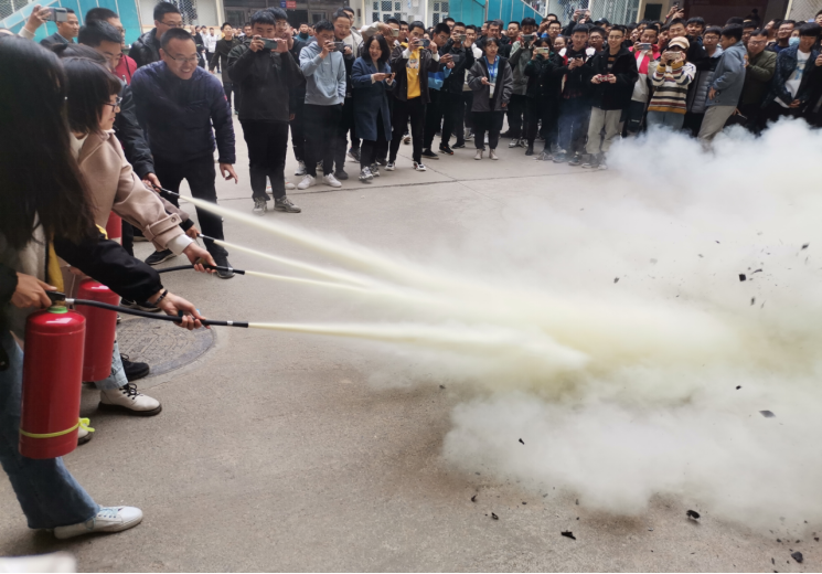 校医院勾虎平大夫对急救知识进行展示和演说,亲自向同学们展示心肺复苏模拟流程等。演习的第三项由安全保卫处教育管理科科长向远峰老师向大家讲解灭火器的使用方法,并安排学生代表动手操作并进行试验。